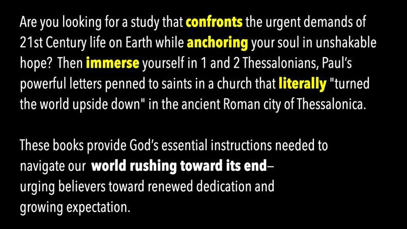 My challenge to you is, are you looking for a study that confronts what we're all facing in 21st century life? Do you want your soul anchored in unshakeable hope? Well, my recipe then is to anchor yourself by getting immersed into 1 and 2 Thessalonians. Those are Paul's powerful letters, penned to people just like US saints in a church that literally the book of Acts says turned the world upside down. Actually, the book of Acts records that the people of Thessalonian accused Paul, of turning the world upside down in the ancient Roman city of Thessaloniki. The two books, these epistles, provide God's essential instructions needed to navigate a world just rushing toward its end. And here's what 1 Thessalonians does, it urges us toward renewing our dedication every day with the Lord and growing in our expectation of Christ any moment return.