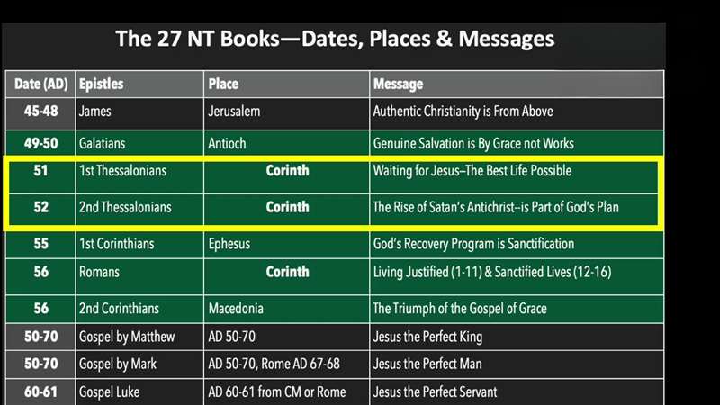 Now what's ahead? There are 27 New Testament books. James is the first, Galatians the green part, or Paul's epistles was his first epistle about genuine salvation. Now we're in his very first church epistles in the center there written from Corinth. Here are the message, waiting for Jesus, the best life possible, I already shared that with you. And the rise of Satan, Anti-christ as part of God's plan. Then Paul wrote to Corinthian, 1 Corinthians, then he wrote Romans, then he wrote 2 Corinthians. Look what's after this. The Gospel, Matthew, Mark, and Luke and all of that we explain in our Paul's Life and Letters.