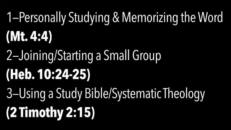 Well, three things I'm going to share with you personally: study God's Word, join a small group, use a systematic theology and a study Bible. And I'm going to go through these each one at a time.