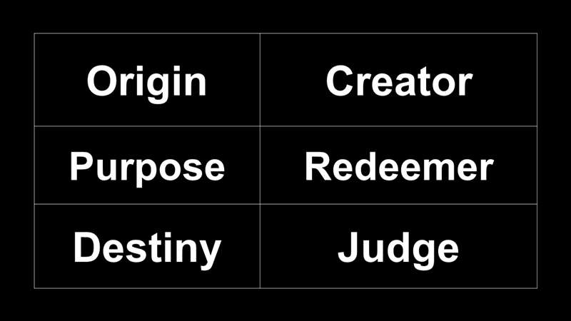 Now basically, that also is the framework of the Bible. Genesis 1 and 2 introduce us to the Creator. Genesis 3 to Revelation 5 talk about His work of redemption. Revelation 6 to 22 is all about the judgment that's coming. And that amazing framework is what we have in the Bible.