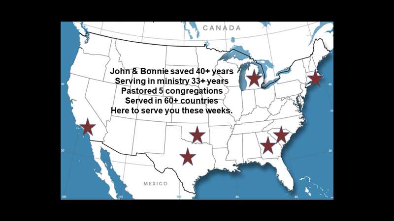 This is where we served. I was born in Michigan. I went to school in South Carolina. I graduated in Georgia. Then I graduated in Los Angeles. Then I pastored in Rhode Island, and then I passed it in Oklahoma. Went to school at Dallas Seminary and pastored in Michigan. And now, Bonnie and I, are full time missionaries. We minister in Sub Saharan Africa. Oh, Africa is not on your map, but the part that's not on your map, we minister. I'm faculty at a seminary in the Middle East. I teach Arabic pastors, church planters. We work in East Asia, in China, and training a lot of those that work in Central Asia. We also work with the refugees in Europe. And those are where we spend our time.