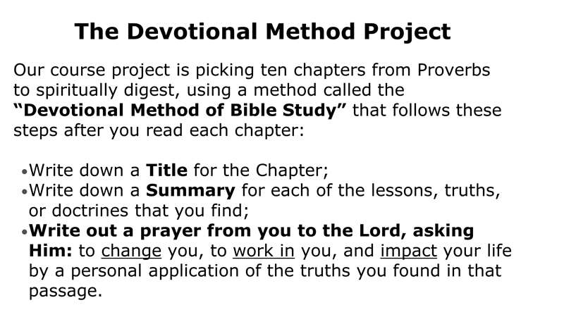 What is the devotional project? A written devotional study that you do and in that first video I explained the amount and the number of them. All the students want to know how much. I say about, at least, a typed page on each one of these. So, you have a 10 typed page project that you turn in, for credit to your course. You write down the title, that's the first part. You do a summary of all the lessons, truths, or doctrines and then you write out a prayer. The prayer is asking God to either change you, work in you, or impact your life by an application from some part of His word.