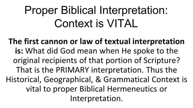 Let's go back to the slides. Now we get into the bedrock, how do you understand the Bible? Proper biblical interpretation. We need to understand that context is vital. The first canon or the law of textual interpretation is: what did God mean when He spoke to the original recipients of that portion of scripture? That's the primary interpretation. Thus, the historical framework, the geographical, the grammatical is vital to proper biblical hermeneutics. Now, the word hermeneutics is the theological term, or you might have heard the term interpretation, how to interpret the Bible.