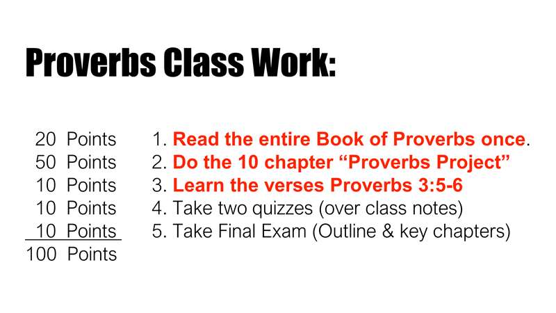 Now, this is the assignment sheet. Here are the first three that all of us, whether we're enrolled or not, have to do. But for those of you that are enrolled there is a point system. Your grade is based on a basic hundred percent points, 20 points are reading the book of Proverbs, the 10-chapter projects are half the course grade, learning the verses 10 points, the two quizzes over class notes, I'll explain that, and the final exam are the rest.