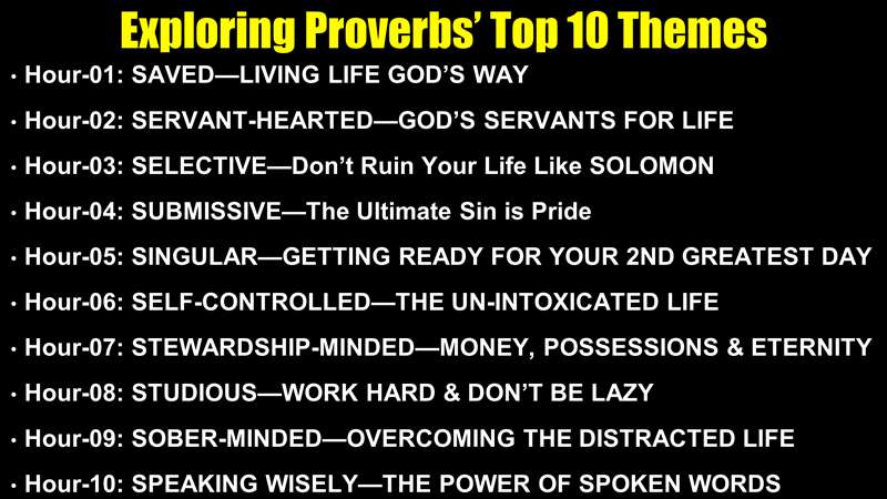 Now, let me take you to the next slide. I'll give you an overview of what we're going to do. I call this the, Exploring the Proverbs class themes. Hour one, we're going to look at salvation. How to know that we have biblical salvation and how the book of Proverbs summarizes the message of the Bible.