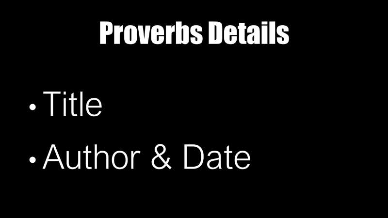 The title in the Hebrew Bible is the Proverbs of Solomon. It's also the Greek Septuagint title, The Proverbs of Solomon. Proverbs pulls together the most important 513 of the 3000 Proverbs that Solomon spoke. Now that's interesting, look up from your slide. We don't have all of his Proverbs; we only have the 513 that God said were the inspired word of God. The other 2,487 were great, they were very wise. They were not the living and abiding word of God. So, we have captured for us, those Proverbs God wants us to have. Now, look back down at your slide. The word proverb means to "be like”. It just is a Hebrew word that means to "be like," it's a book of comparisons between common concrete images. It's the sum of wisdom that's personified in Jesus Christ. As far as the author and the date, it's the Proverbs of Solomon. As I said to you in the outline of the book, it's also a compilation of the sayings of the wise. That's actually what it says in that section, 22 to 24 and also 25 to 29 chapters. 25 to 29 Solomon wrote boat, but it was collected by King Hezekiah, pulled out of those 3000 Proverbs. Solomon by the way, also wrote Psalm 72, Psalm 127, the book of Ecclesiastes, and the Song of Solomon.