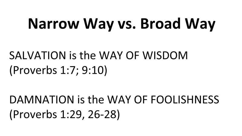 Now back to the slides. The narrow way is Christ's way, the way of wisdom and salvation. The broad way, which the whole book of Proverbs describes is the way of damnation and it's the way of foolishness.
