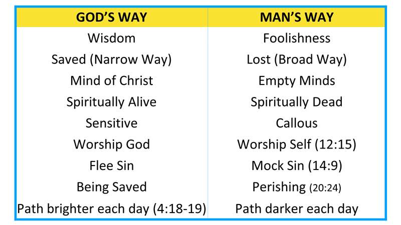 Here's the other side and look back at your slide. Man's way. This is the way of foolishness, the lost, the broad way, empty mind, spiritually dead, callous, unfeeling, worshiping self, mocking sin, perishing more every day. Let me read to you verse 19,