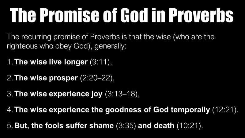 Now, let's look at the promises of God in the book of Proverbs. The reoccurring promise of God is that the wise, those who are righteous, who obey God, those who know Him, who are saved: