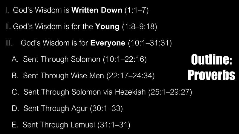 Here is the outline, if you see that slide, this by the way is going to be on your quizzes. The quizzes we'd be over this outline as well as the study we do on inspiration. Look how simple it is. God's wisdom written down, that's the first seven verses, Gods wisdom for the young. Many of you enrolled, I know that those of you in East Asia, are young and many of you online are. That's chapter 1 through 9. Then God's wisdom for everyone, that's the rest of the book.