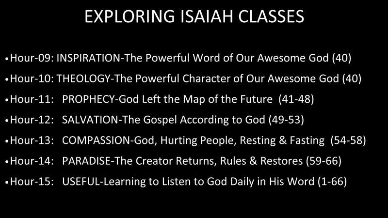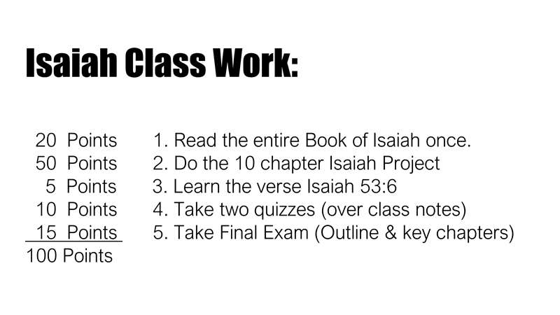 If you're taking this course for credit, read Isaiah, do the devotional studies, learn the memory verse, take the quizzes and tests and all that. All the rest of you, read Isaiah. As you're reading, if you want the ultimate challenge, do it for every chapter of the book or find 10, write a title for the chapter. Isaiah 53, suffering servant. Isaiah 48 the Trinity, whatever you want to say. Prophecy in 44. Find the lessons, apply it to your life. For those of you that are students, I would like these to come typed out. One per page, that's the title, the summary of everything you found and your prayer, make sure you put your name on it and the date and of course your instructors there in the classroom in East Asia will tell you how to turn those in.