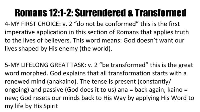 Now, the next slide, it was a very exciting day, sometimes these take quite a while. The fourth point I found is, my first choice, verse 2, do not be conformed. By the way, this is the first imperative, that's a command in the Bible, in this section of Romans that applies truth to the lives of believers. This word means, God doesn't want our lives shaped by His enemy the world. He wants me not shaped by the world.