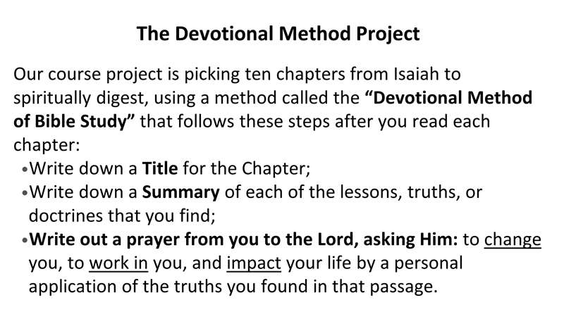 Now, the devotional method project. I'll read this and I'll show you on the marker board. Our course project is picking 10 chapters from Isaiah, remember there are 66. You could either pick the key chapters or any chapters you want, but you have to pick 10 of them. You use a method called the devotional method of Bible study. There are 12 different Bible study methods that have been historically chronicled, most recently by Rick Warren. There is the devotional method, thematic method, the topical method, the word study method, book study method, biographical, exegetical, on and on. We're only talking about the very simplest and most powerful.