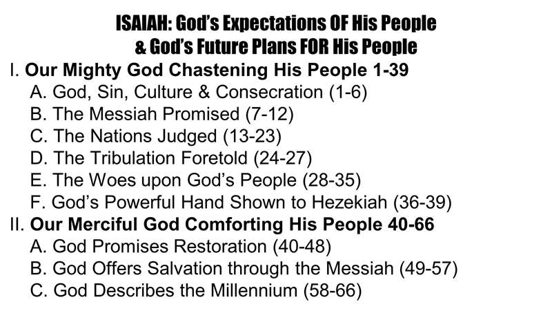 The next slide is the overview of the book, the outline, and this is going to be on your quizzes and test. For those of you that are just auditing, this is a great tool. You might want to screenshot this if you want to keep it. It's Isaiah, has 66 chapters, the first 39 here are basically about God's chastening and judgment, talking about the events. You can see each of them with the chapters that cover them. Then there's a marked change in Isaiah, starting in chapter 40. It's God's promise of restoration and it's a very exciting turn of the whole tone of the book, the offer of salvation with the Messiah. Then, all the way through the ultimate restoration coming in the millennium.