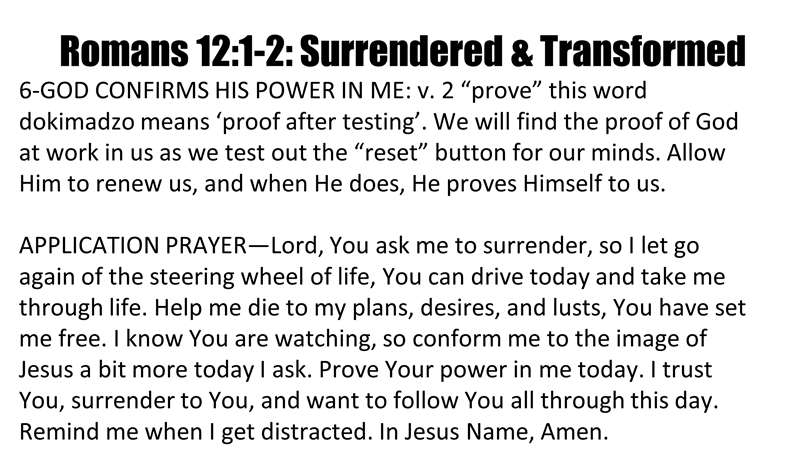 Hey, that's back to our devotional project. We find all this truth, but then we have to respond. The application is me responding. That's how I'm sanctified, become useful. I don't just, I'm not merely a hearer of the word of God, but what James said, a do-er. This prayer is how I become a do-er of the word. So, here we go, "I beseech you therefore, brethren, by the mercies of God, that you present your bodies a living sacrifice, holy, acceptable to God, which is your reasonable service. And do not be conformed to the world," this world, "but be transformed by the renewing of your mind, that you may prove what is that good and acceptable and perfect will of God."