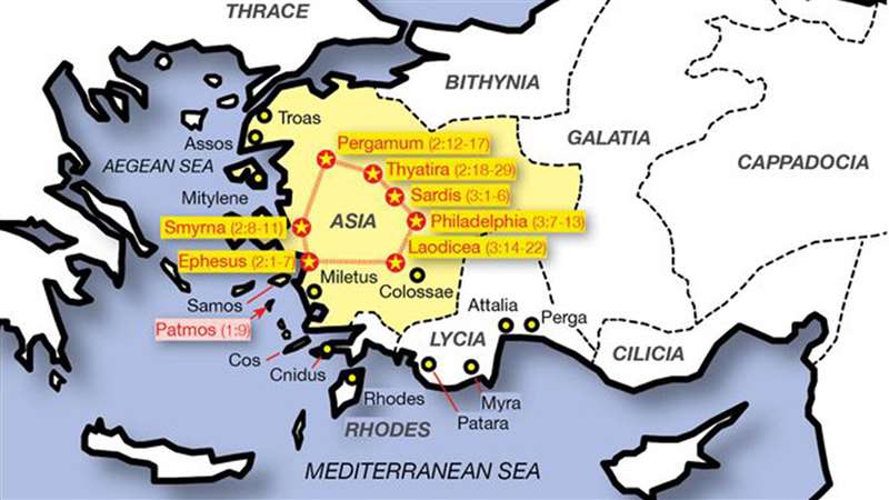 In this slide, you can see. The specific seven churches. See that map of Turkey, modern day Turkey. That's the Roman province of Asia in the time of Christ and of the apostles. That area had seven cities. Actually, they follow the Meander River, the postal route of the day, it starts in Ephesus.