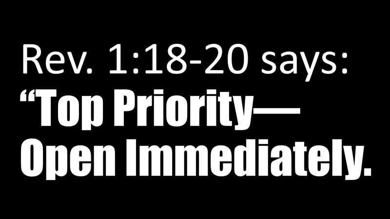 Number one, Revelation 1:18-20 says this message should have top priority. Now, do you see why in the early church, as I drew Revelation is the most preached about book of the Bible. Why? Because they understood where it came from… look at verse 18. “I am He who lives and was dead, and behold I'm alive forevermore. I have the keys of Hades and of Death. Write these things” and send them to the church. Jesus said, this is top priority. It's kind of like getting a FedEx delivery where the delivery man is sitting there with his electronic tablet and says, here sign, this is high urgent priority. It's overnighted to you. That's how important Revelation is. So, what's the message? Number one, it's the only book of the Bible all about Jesus.