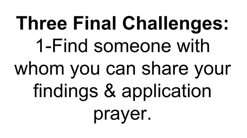 Before we go, I always give you three challenges. Find someone you can share your findings and applications with. So, you write them down. And then this is how you start a small group. You say, hey, I'm studying the Bible. I'm going through the whole book of Romans, one chapter a week. I'm writing down everything I find. I'm writing a prayer. Can I share that with you? I'm for the, like, someone just wrote me this week. They said, for the first time they thanked me. They said, thank you. Through your classes, I've become a Christian for the first time. I understand the Bible. And now I'm telling people I understand the Bible. I know God. I've met Him. I've talked to him. I hear His voice through His Word. And they're actually having an evangelistic Bible study. They're going through and I sharing the Gospel and explaining things. So, find someone you can share your findings and application prayer with.