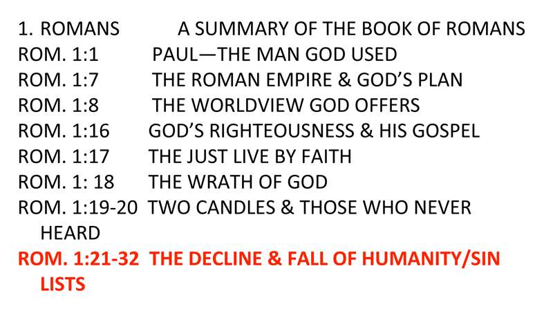 This is our overview of Romans; see the sound and I'm talking using the terminology from the book of Titus. Do you remember how Titus is that we're supposed to have healthy doctrine, sound doctrine so sound or healthy doctrines? What are they? As we go through Romans, here are the chapter numbers. This is the chapter we're in and it's the doctrine of the descent of humanity away from God. And what's so important about that is it explains everything.