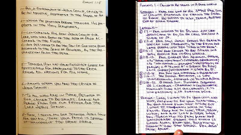 This is a picture of the 17:18, that's what it's called, 17:18. That's the notebook where you hand write it. And this is my devotional method, just plain old moleskin where I write "Romans one called to be saints in a dark world". The summary, here are all the lessons, and there's my prayer.