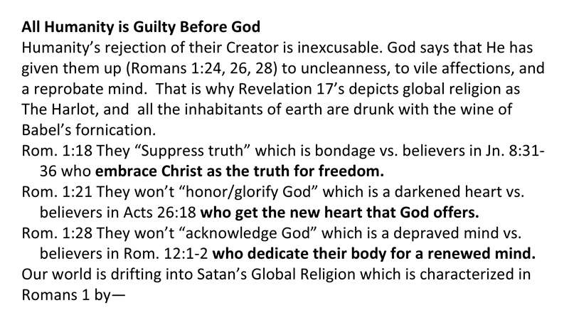 And it says, our world is drifting into Satan's religion that's characterized by rejecting their Creator. That's 24, 26, and 28 of chapter one. And that's why Revelation 17 depicts the global religion of the Harlot because humanity wants to suppress the truth.