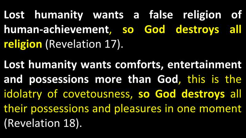 Humanity loves religion. God destroys religion in 17. Humanity loves comfort and possessions; God destroys all that in chapter 18.