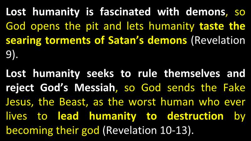 Then, in chapters 10 to 13, the lost humanity wants to rule themselves and reject God's Messiah, so God sends a fake Jesus. Satan has always wanted to bring his Anti-christ in. He's had one every generation. Nero was one, Alexander the Great was one, Stalin was one, and Mao Zedong was one. These are great anti-Christian leaders of the world who are very successful. Hitler was one. Hitler came so close to winning World War II. He made two fateful mistakes. One, he didn't take the Romanian oil fields. If he had, he would've had enough to keep his tanks going permanently. He shouldn't have attacked Russia, as stretched out as his supply lines were. He should have waited, actually, about six months. It would've been a totally different outcome. But God was orchestrating that because it wasn't time for the Anti-christ. He becomes the fake Jesus. The Anti-christ is the worst human who has ever lived, and he leads all of humanity to destruction. That's 10 to 13.