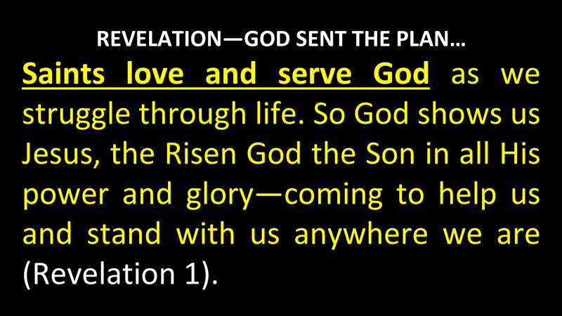 Now, let's go from the picture to the words, Revelation 1. What is Revelation 1 about? Saints love and serve God as we struggle through life. John is struggling through life. He's a lot older than I, and he's in prison on a Roman prison colony, kind of like Alcatraz or something, San Quentin or Leavenworth. God shows Jesus coming to him as risen, God, the Son, and all His power and glory, and He comes wherever we are and stands with us. Jesus knew John's address, and He came right to where he was. Jesus knows your address. You think I don't have as many problems as John does. No, but yours are more pressing than John's because they're yours. Jesus wants you to know He comes right where we are. He knows where we live.