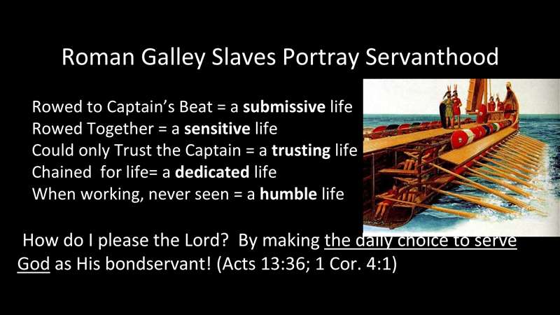 So, I said this to you already when I was reading, the whole book of Revelation is about God wanting us to be His servants. Paul illustrates servanthood by using galley slaves. You've all seen movies with galley slaves, Ben Hur, or whatever. A galley slave was completely chained down and obeyed whoever told them. How did Paul apply it? He said do you want to please the Lord? Make a daily choice to submit yourself as His bond servant. We could study that all day, but it's not in Revelation.
