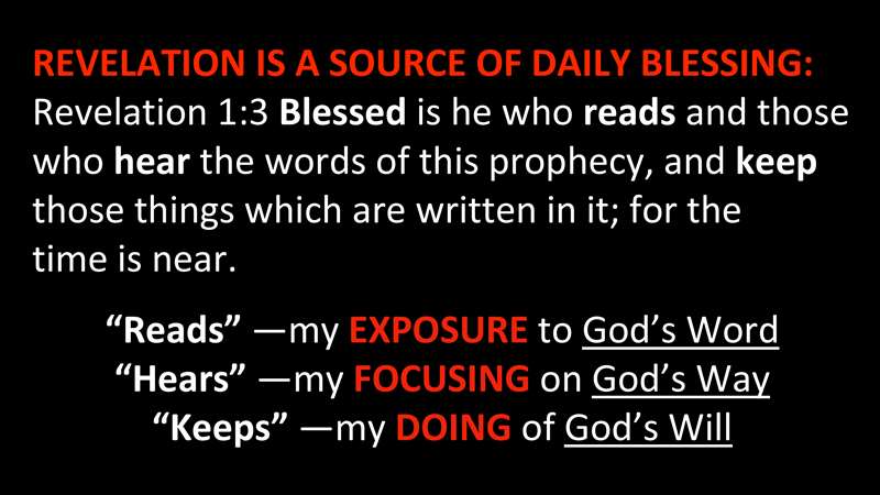 But here is what's in Revelation verse 3. Blessed, and this is the beauty of Revelation. Blessed is he who reads and those who hear. So, right now, I was just blessed by God. I thought about this morning. I woke up at four, and I was reading all the passages that we're covering. I was enjoying it and looking at all the misspellings of my slides. I was getting blessed reading the book of Revelation. It's the only part of the Bible that you're blessed to just read it. So, I just got blessed reading it and hearing it. Look at the last one. Keeping it. Reading is exposing yourself to the Bible. Hearing is focusing on what God is saying, and saying I want that. Keeping it is saying I'm actually going to do this.