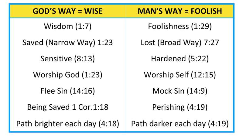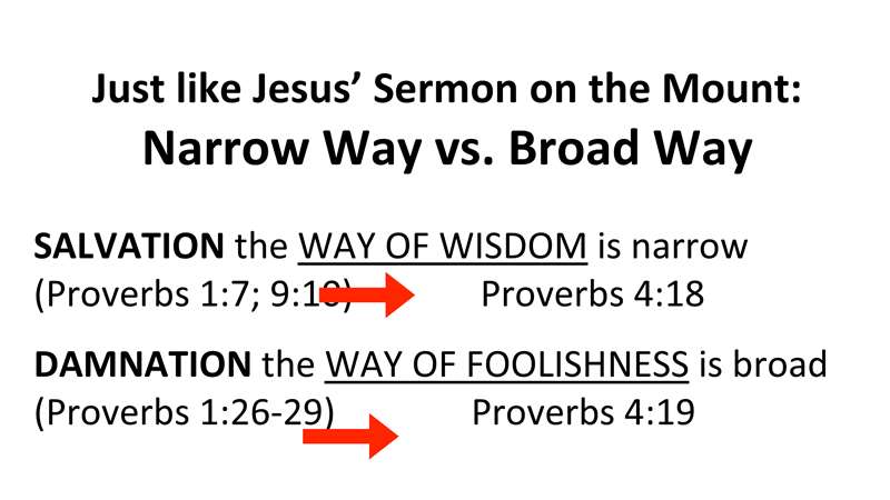It's His, God's Way, is wise, man's way is foolish. God's way is wisdom. Chapter one verse seven. Man's way is foolishness. Chapter one, verse 29. The saved are on the narrow way. Look at chapter one of Proverbs in verse 23.