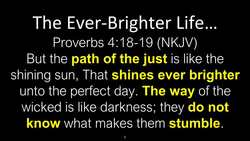 So, the pathway, okay, let's go through this. God offers the ever-brighter pathway. That's the message of the book of Proverbs, verse 18. The path of the, just those who know God's wisdom gets brighter and brighter, doesn't say it, gets more and more comfortable. Doesn't say it gets more and more pleasant. It just gets brighter.