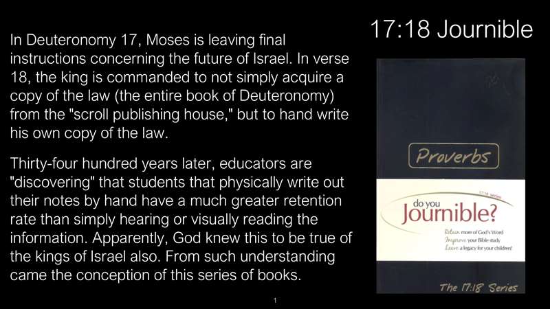 Remember there wasn't a king yet. He was talking about the future King. The King that was coming was commanded to not simply get a copy of the scriptures that we all carry around, not just go and buy one. He was to hand copy his own copy. So, this what Bonnie got me, it is actually Proverbs and it says on there the 17:18 series.