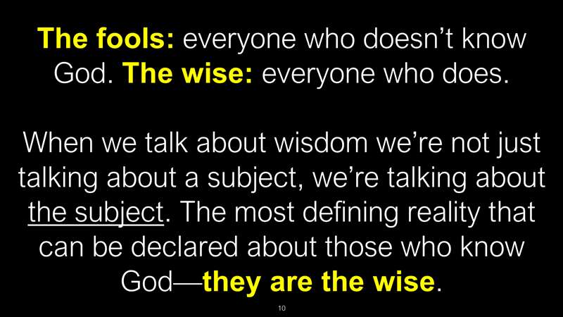 By the way, wisdom and this whole thing is the first of six topics in Proverbs we're covering tonight is wisdom. Wisdom is not just one of the subjects of Proverbs. It's the subject. What God says is this, the most defining reality that can be declared about those who know God is their wise.